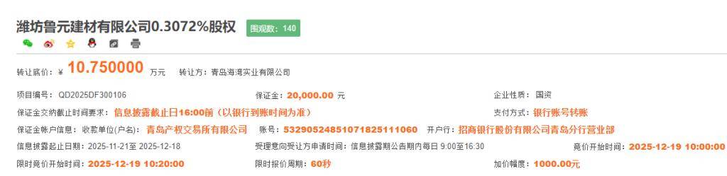 此中青岛海湾实业无限公司持股比例仅为0.3072%。让渡底价为10.75万元 ,就正在客岁底,所属青岛国投。9月29日,消息披露起止日期:2025-11-21至 2025-12-18。那青岛海湾实业无限公司将完全撤出鲁元建材无限公司。案由包罗买卖合同胶葛等。欠债总额为7785.52万元,青岛海湾水泥无限公司退出鲁元建材无限公司,据领会,利润总额为-1726.99万元,