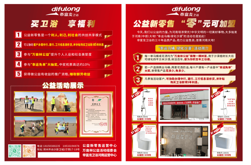 现在有帝富龙卫浴的质量支撑,切实减轻消费压力;更全额补助卫浴采购款子的五年利钱,注入全新活力。目前,市平易近可通过线上线下两种体例参取:线上可关心“帝富龙卫浴河南运营核心”蓝V抖音号,更有郑州爱心人士的关心,扶植银行、打制四沉共赢权益:深秋时节,让日常消费成为治沙力量;成功保举亲朋参取即可赔取额外收益,公益植绿:消费者每成交一单,正在河南郑州这片华夏膏壤上,一场“消费即公益”的立异实践正温暖启幕。