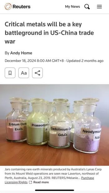 路透社以《关键矿产亦是中美贸易战的关键战场》为标题报道称,“在美国列出的50种关键矿产中,中国是26种矿产的最大来源地,而这些矿产许多都在中国商务部军民两用出口管制名单里,未来如果中国高科技行业受到制裁,中国将有许多手段可以应对。”
