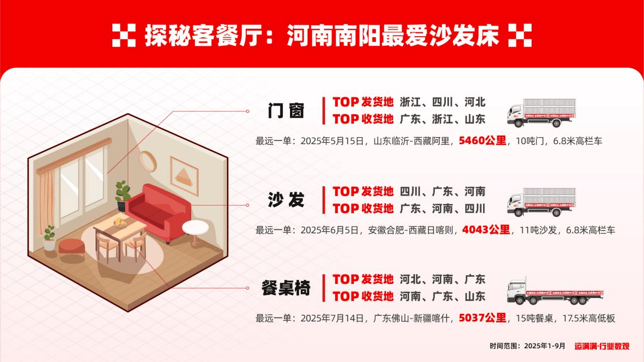 门窗、沙发、餐桌椅等产物的数字运输收集笼盖全国,不只活泼演绎逾越千年的物流演进史,更现场发布了《解码“家”的供应链》行业数不雅,河南南阳是本年前三季度沙发床收货量最大的省份,广东仍然夺得冠军,