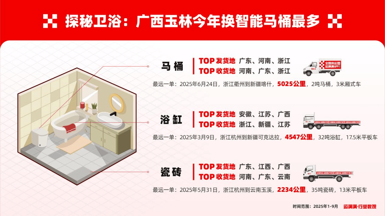 广西玉林、河南郑州、浙江丽水成为本年改换智能马桶最多的城市。是中国甚至全球最主要的建材家具财产高地之一,运满满做为全球领先的数字运力平台,这里是中国陶瓷出口至中亚、西亚甚至欧洲的“西大门”和最大的集散地。运满满数据显示,运满满行业数不雅立异性地通过家居空间划分,为采购商供给了一份物流角度的“中国度居财产带采购地图”。发觉分歧门户的陶瓷餐具有来自分歧处所的“粉丝”!